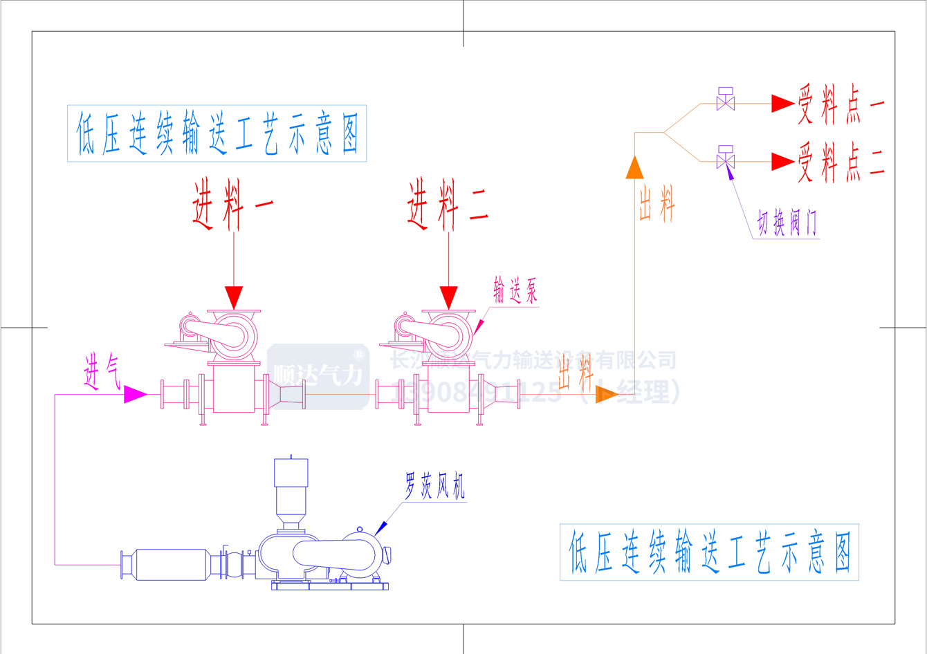 GSB系列连续泵组成的低压连续输送系统。可采用单台布置运行、多台串联布置运行、多台并联布置运行,不仅在工程造价上体现其投资省、而且运行成本低。设备运行只需巡视,不需要人工值守;由于采用低压输送,设备及输灰管内流速较低,输送浓度恒定,输送压力平稳,无任何冲击荷载;设备本体简单,无阀门的频繁动作,设备故障率大大降低;低压连续输送系统的动力气源一般采用罗茨风机(也可视情况采用高压离心风机或空压机),罗茨风机也无需设立空气净化系统;由于无进、出料阀门及排气阀门,系统设备和管道磨损小、使用寿命长。由低压连续输送泵组成的低压连续气力输送系统,由于具有上述特点,因而同时具有造价低、运行指标优越的特点,不仅在工程上马时体现其投资省,更在于以后的运行使用过程中将不断体现出较低的运行维护费用。